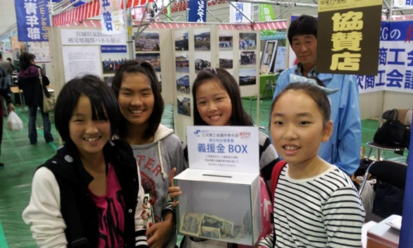 そして、10月に開催された「みよし商工フェスティバル」で気仙沼YEGご協力のもと我々三次YEGの青年部ブースを出店し、昨年と今年の被災地の現状パネル展示と、東北の地酒販売・義捐金BOXを設置させて頂きました。これら全ての利益と貴重な義捐金を、津会議で再会した気仙沼YEG橋本会長に手渡しさせて頂きました事をこちらでもご報告させて頂きます。