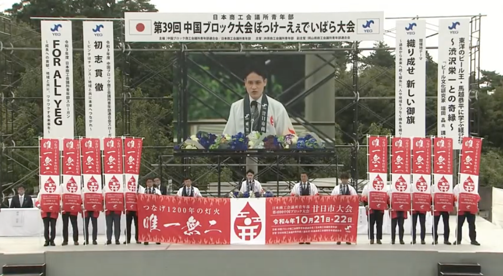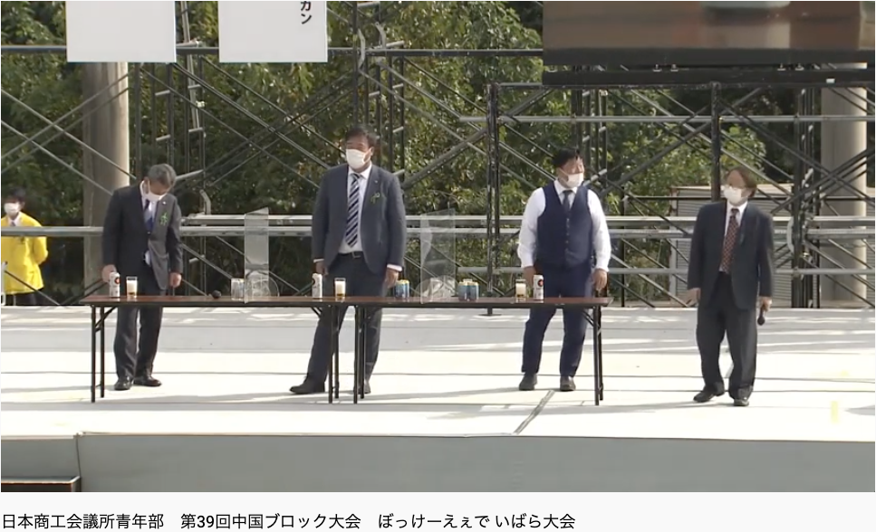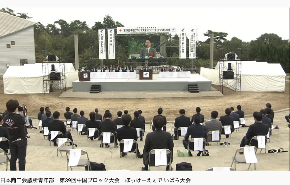 2021年(令和3年)10月16日(土)に 岡山県井原市美星町三山5007 中世夢が原(特設会場) で開催された日本商工会議所青年部 第39回中国ブロック大会 ぼっけーえぇで いばら大会(ハイブリッド開催)に現地2名、オンライン8名(うちOB1名)の合計10名で参加いたしました。