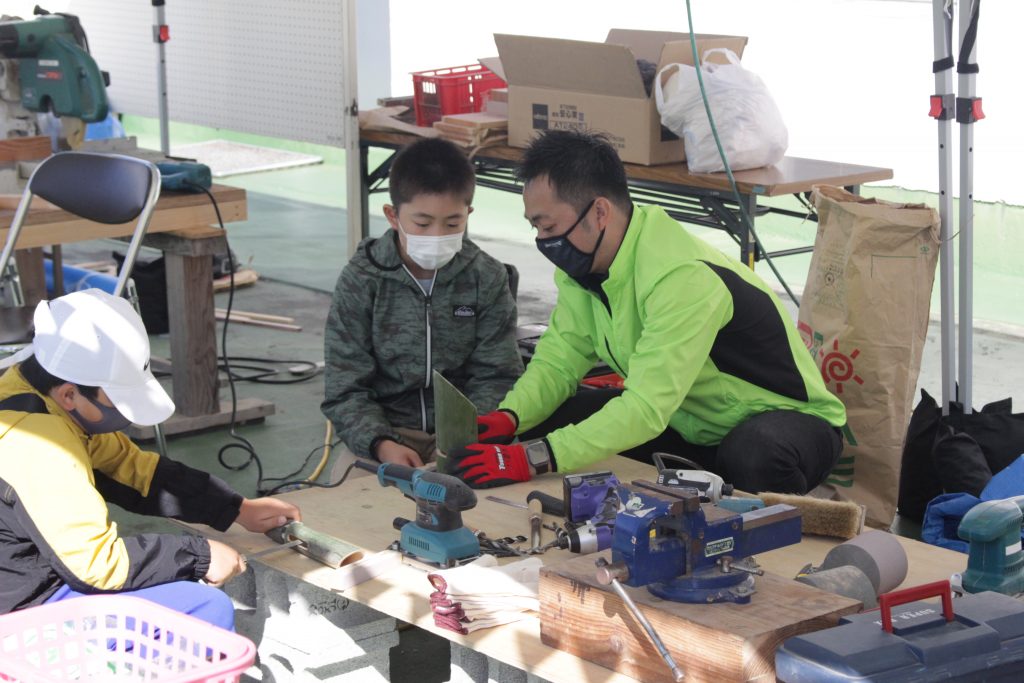 有建工房 前田さん 電動工具を使ってスマホスピーカー作り