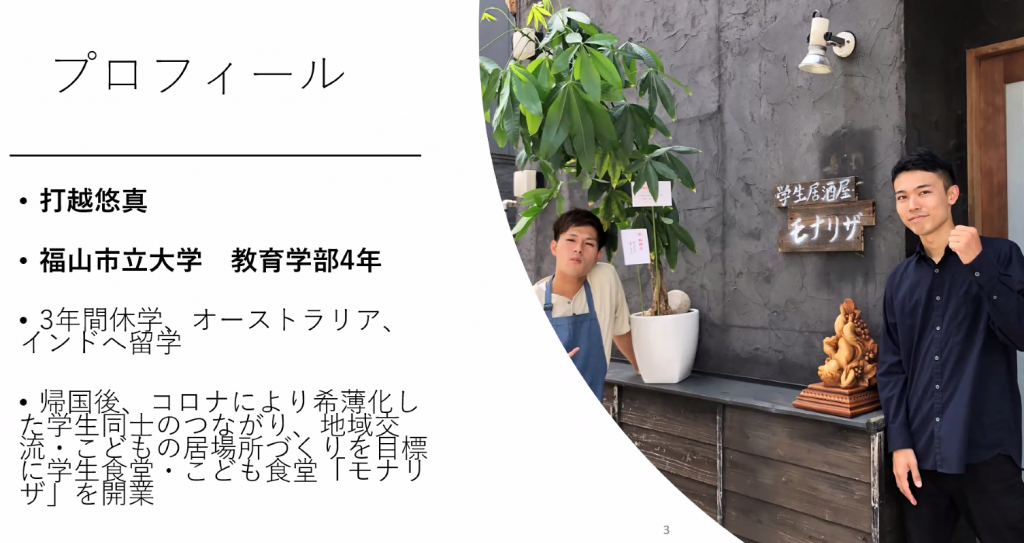 後半の②福山YEGの分科会においては、福山市立大学4年生打越悠真氏が代表を務められる「モナリザ食堂」についての話を中心に玉井由樹氏、山田哲矢氏を交えて起業、アイデア、また周りの力を借りながら、どのように継続してきたかについてお話いただきました。